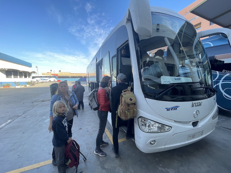Een busreis tussen bijvoorbeeld Marrakesh en Agadir kost rond de dertien Euro per persoon. Je kunt een stoel reserveren en er kan een grote tas mee. Voor de ruimbagage betaal je ter plekke bij de balie nog dertig cent per tas. De reis tussen de twee steden duurt drie uur. Ligt er nog een stadje tussen deze plaatsen waar je uit wilt stappen, kijk dan of hij tussen de keuzelijst staat. Deze bussen rijden over de grotere wegen.