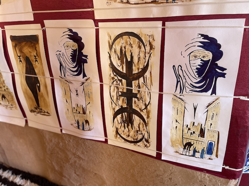 De berbergids neemt ons mee in het dorp en we mogen op bezoek komen bij een berberfamilie in huis. Berbers zijn heel gastvrij. De gids vraagt of we binnen mogen komen. In de hal hangt het helemaal vol tapijten en ook op de vloer liggen deze. Ik denk in eerste instantie nog dat dit zo hoort, het blijkt echter al snel te gaan over het maken en kopen van vloerkleden. Niemand in de groep heeft interesse.