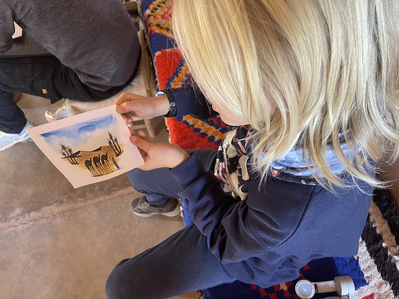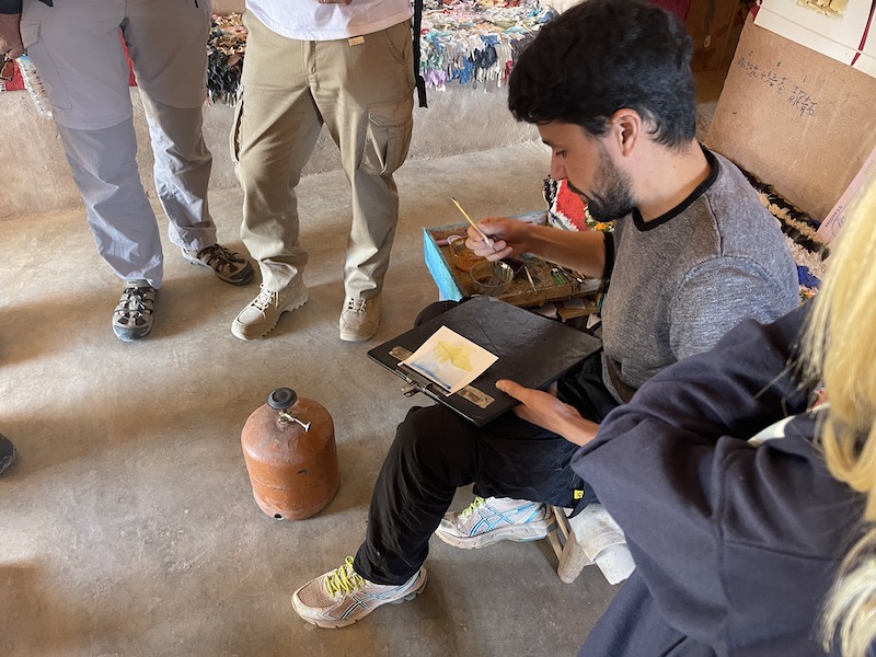 In het dorp brengen we een bezoek aan een tekenaar die werkt met waterverf en kleine schilderijtjes maakt.