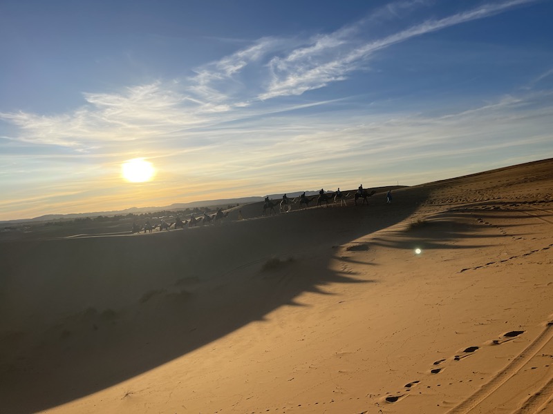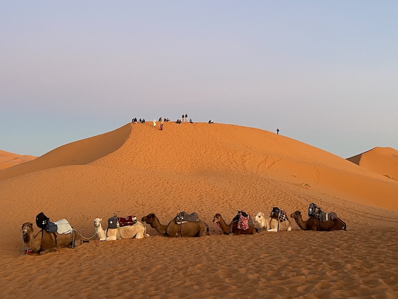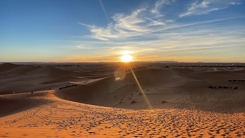 Gezien de kou, valt het ons zwaar om naar de zonsopgang te gaan kijken. De dromedarissen die wachten al op ons. Ongelooflijk dat die dieren het niet koud hebben gehad vannacht. Onze vingers plakken bijna vast aan de metalen handgrepen waarom onze handen zitten tijdens de terugrit.