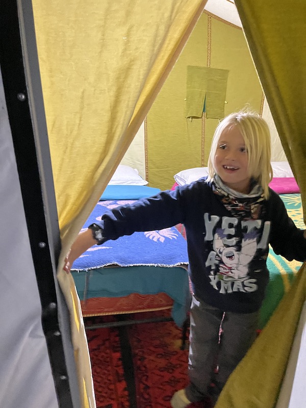Nadat de zon is ondergegaan, koelt het zeer snel af en is van het woestijngevoel nog weinig te merken. We gaan snel richting het kamp, even kijken wat voor tent we hebben en zorgen dat we op tijd zijn voor eten.