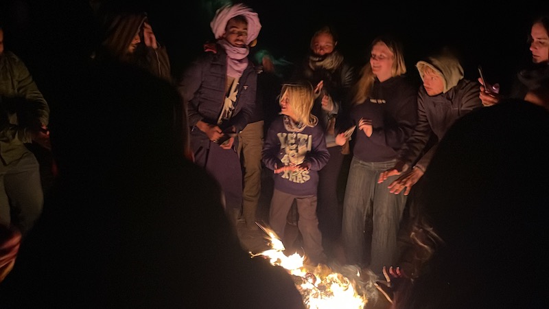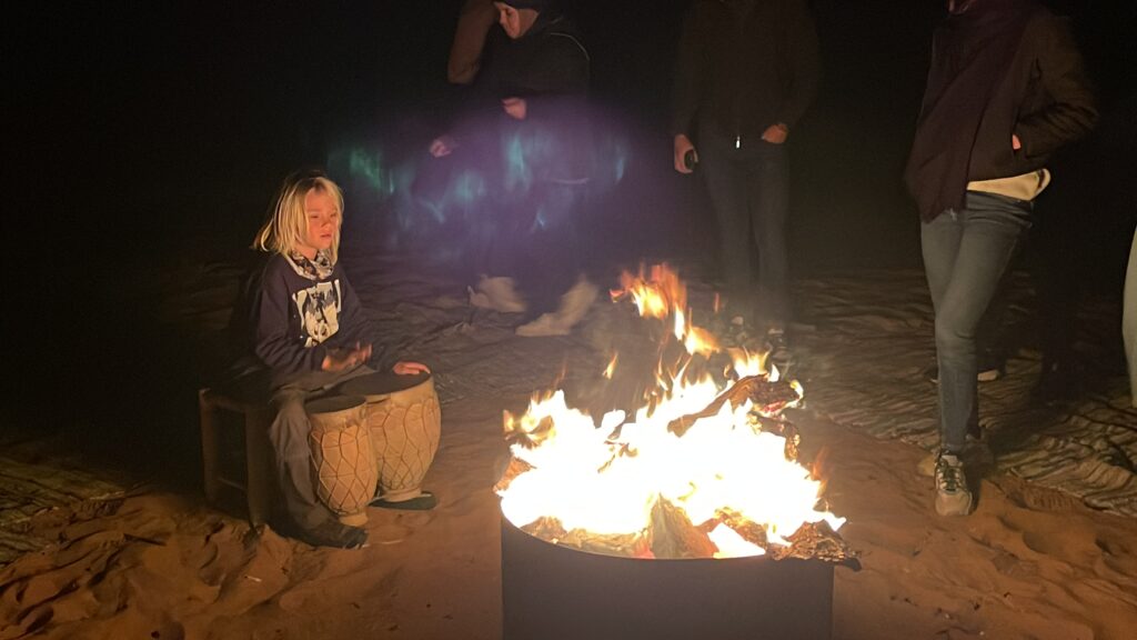Ik geloof dat het hoofd zo’n beetje eraf gevroren is vannacht. Nooit gedacht dat het in een woestijn zo koud zou kunnen zijn. Rond tien over half acht moeten we weer klaar staan voor het ontbijt, de zonsopgang en een nog een stukje op de dromedaris. We zullen blij zijn als de zon te voorschijn komt en de lucht een beetje opwarmt.