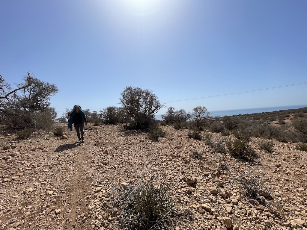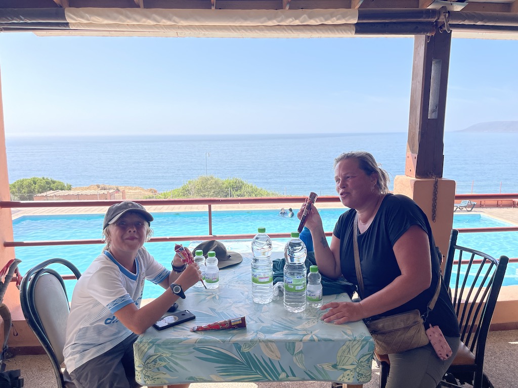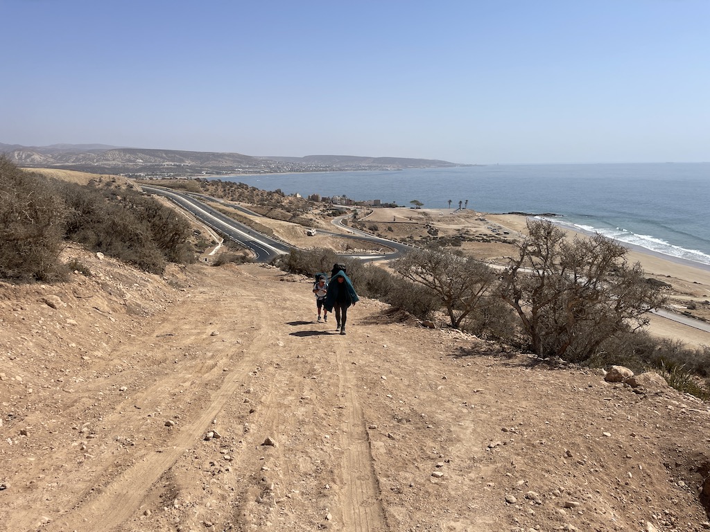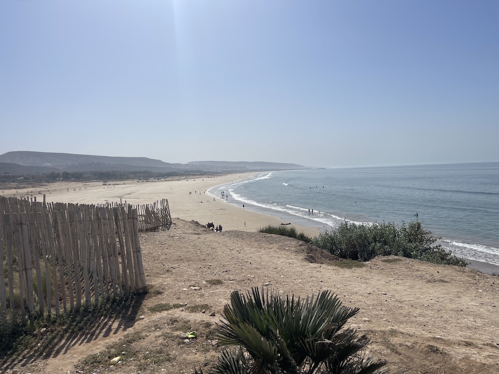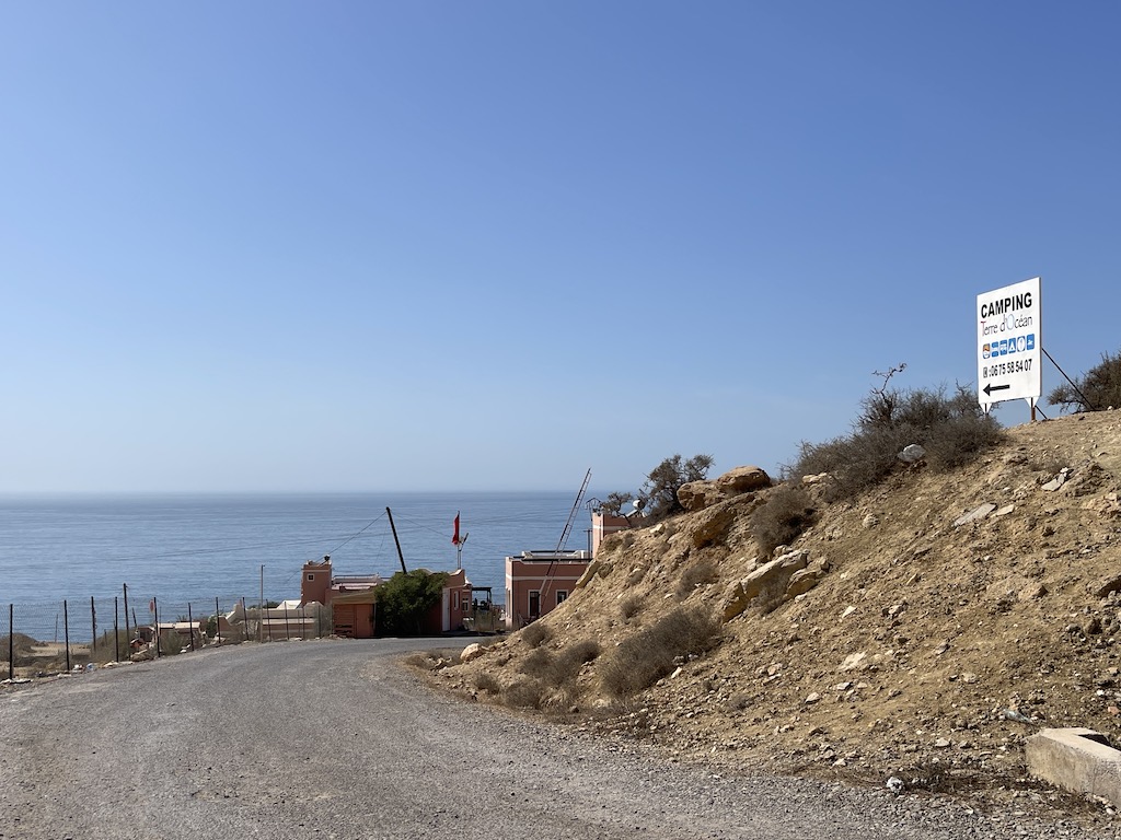 De camping doet zijn naam eer aan, want het uitzicht over de zee is prachtig. Er zit een zwembad bij en we hebben nog net genoeg geld voor drinken en een tajine met kip. Het ontbijt zullen we morgenvroeg over moeten slaan. Er is geen winkel en we hebben ook bijna geen contant geld meer en pinnen kan hier op veel plaatsen niet. Wat overig trouwens prima is, om het contante geld een beetje in omloop te houden. We weten ook niet zeker of er in het volgende plaatsje een pinautomaat is. Mocht dit niet zo zijn, dan moeten we met een taxi terug naar Tamraght om te geld uit de automaat te halen.