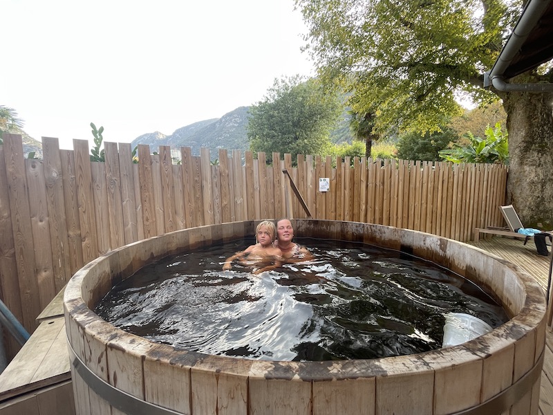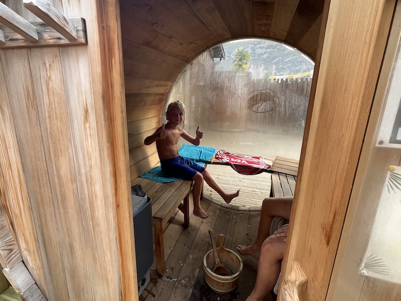 Inmiddels is er op de camping het een en ander veranderd in twintig jaar. Een nieuw restaurant, een zwembad met grote glijbaan en een gedeelte met sauna en hot-tube. Van deze laatste mogen we gratis gebruik maken. Aangezien er verder niemand is, hebben we een eigen privé-sauna. Heeeerlijk!!!!